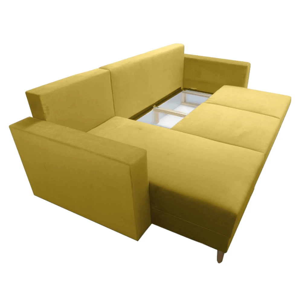 Rohová rozkládací sedací souprava – žlutá moderní dominanta interiéru