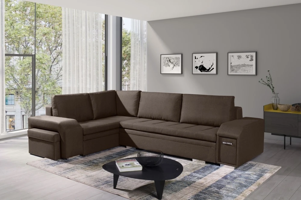Sedací souprava Alana v sobě spojuje 2 důležité prvky, které nesmí chybět žádné sedací soupravě. Jsou to pohodlí a praktičnost. Praktickou stránkou této sedací soupravy je možnost rozložení pro příležitostné přespání návštěvy a nepostradatelné úložné prostory. Úložný prostor s univerzálním využitím najdete v područi, dále v taburetu, který je možno zasunout do druhé područe a samořejmostí je i úložný prostor v sedací soupravě. Jsou dva a využijete je např. na lůžkoviny. Sedací souprava je celočalouněná, takže je vhodná i k umístění do prostoru. Výplň sedáků tvoří kombinace pružin s kvalitní PUR pěnou. Tato kombinace spolu s velkými opěrnými polštáři, zajišťuje pohodlí. Sedací soupravu nabízíme v levém i pravém provedení v několika trendy barvách. Vyobrazené doplňky a dekorace nejsou v ceně. Vzorek látky, ve které bude sedací souprava dodána, je vyobrazen v doplňkových fotografiích.