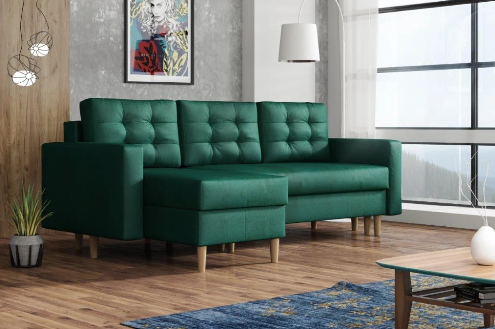 Sedací souprava Anabel je krásným designovým RETRO kouskem, který výborně zapadne do moderního i klasického interiéru. Retro design podtrhují dřevěné nohy a vtahy na opěrných polštářích. Její velkou předností je pohodlí, praktičnost a univerzální použití. Tzn. že si ji můžete podle potřeby sestavit jako levou nebo pravou, což je výhoda při zařizování obývacího pokoje. Nemusíte přemýšlet do jakého rohu postavíte sedací soupravu, jednoduše ji podle potřeby přizpůsobíte. Sedací souprava je rozkládací a může tak sloužit k občasnému přespání Vaší návštěvy. Samozřejmostí je i praktický úložný prostor, který je v obou částech sedačky a můžete ho využít např. na lůžkoviny. Sedací souprava je potažena látkou a nabízíme v několika oblíbených barvách. Výplň sedáků tvoří kombinace pružin s kvalitní PUR pěnou, což zajišťuje velmi pohodlné sezení. Sedací souprava je vhodná i do menších pokojů. Vyobrazené doplňky a dekorace nejsou v ceně.