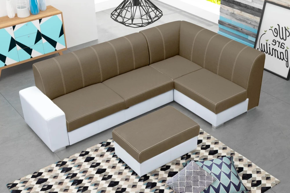Rohová sedací souprava Rest s taburetem zdarma je vhodná do všech moderních interiérů. Je rozkládací a má praktický úložný prostor. Pohodlnost sezení zajišťuje kombinace pružin faliste s kvalitní PUR pěnou. Jednoduchým rozkladem vznikne lůžko vhodné k příležitostnému spaní. Sedací soupravu nabízíme v kvalitní potahové látce v kombinaci s bílou EKO kůží, a to v několika barevných provedeních, které také najdete v naší nabídce. V ceně sedací soupravy je taburet 55x90 cm. Ostatní vyobrazené dekorace nejsou v ceně.