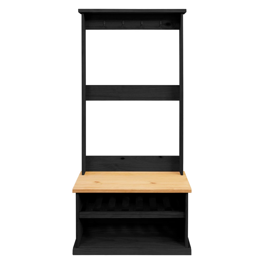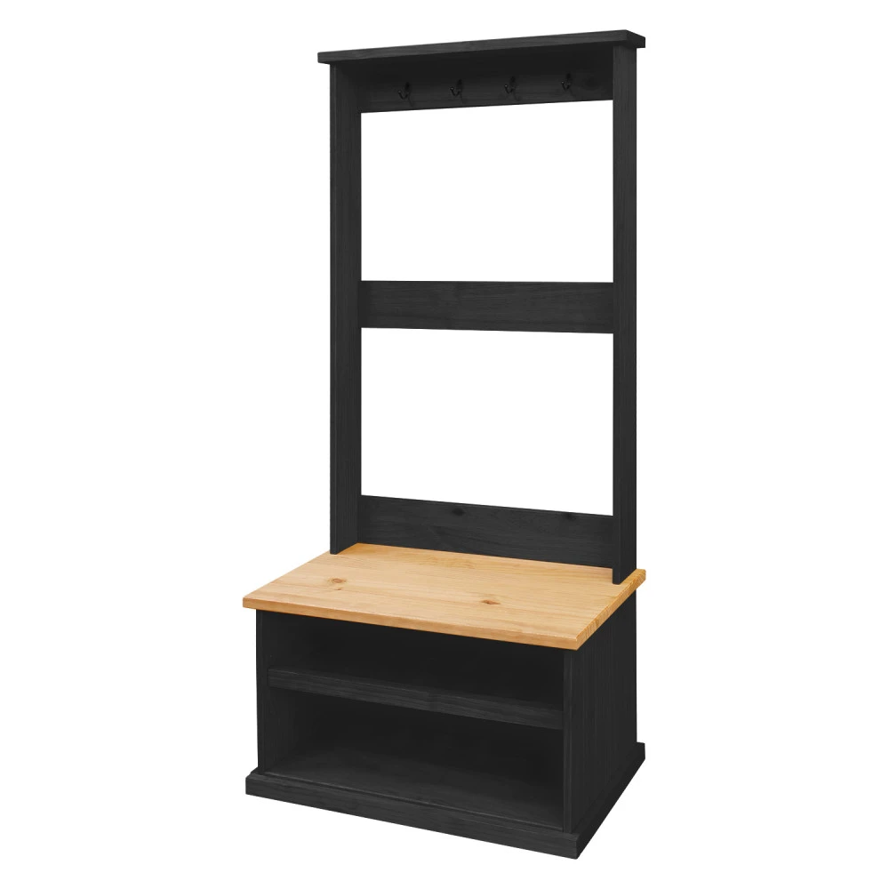 materiál masiv borovice voskovaná v medovém a černém odstínu 4 kovové háčky, 2 otevřené police na boty výška sedu lavice 45 cm součást sestavy Corona 2