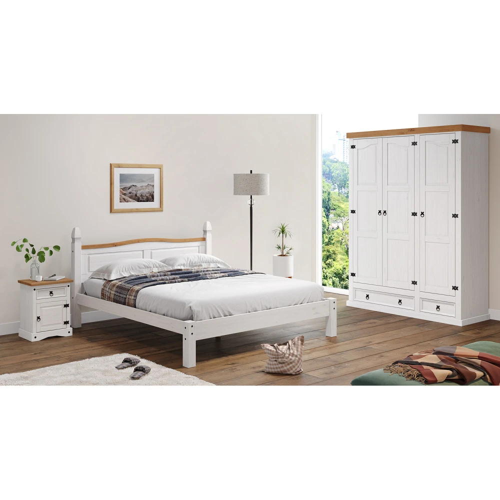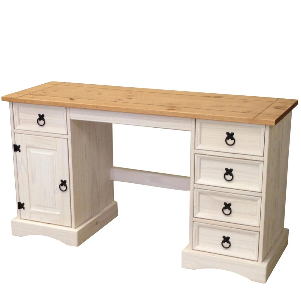 materiál masiv borovice voskovaná v bílém odstínu horní deska masiv borovice voskovaná v medovém odstínu 5 malých zásuvek, 1 dvířka, kovové ozdobné úchytky součást sestavy Corona bílá