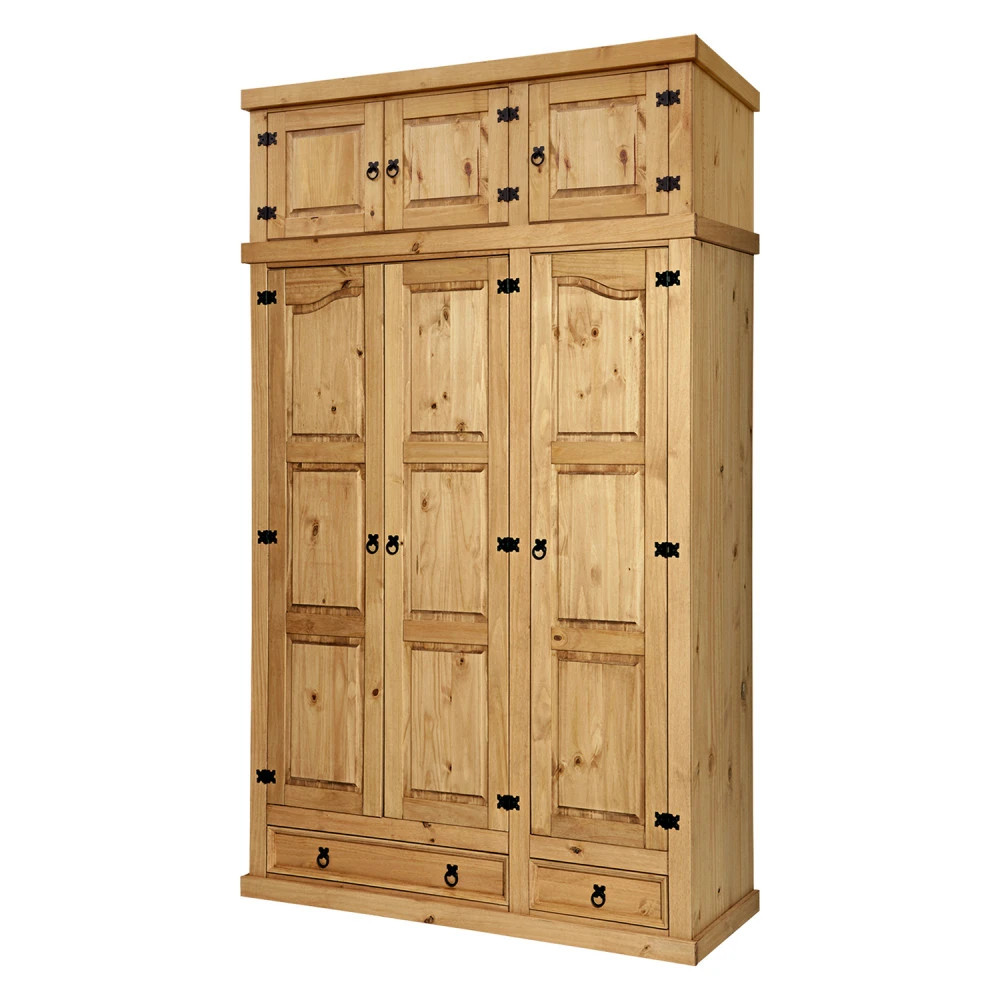 materiál masiv borovice voskovaná v medovém odstínu prostor dělený v poměru 2:1 širší část šatní tyč a police, užší část 3 police ve spodní části 1 velká a 1 malá zásuvka, kovové ozdobné úchytky doporučený nástavec CORONA 16952 součást sestavy Corona