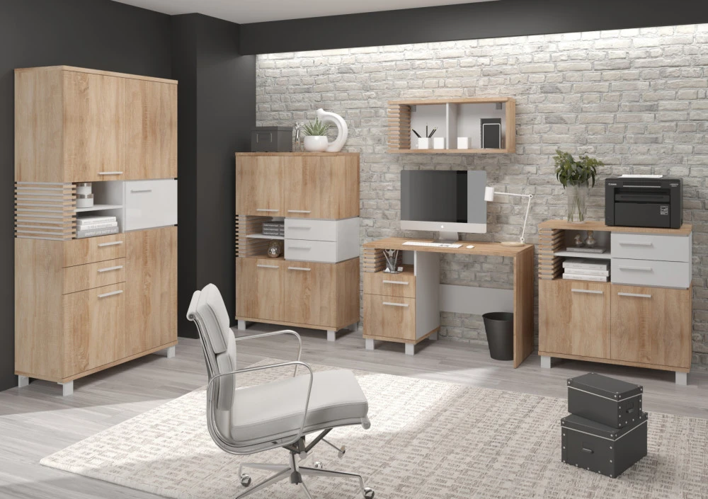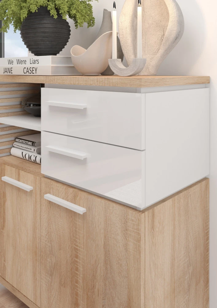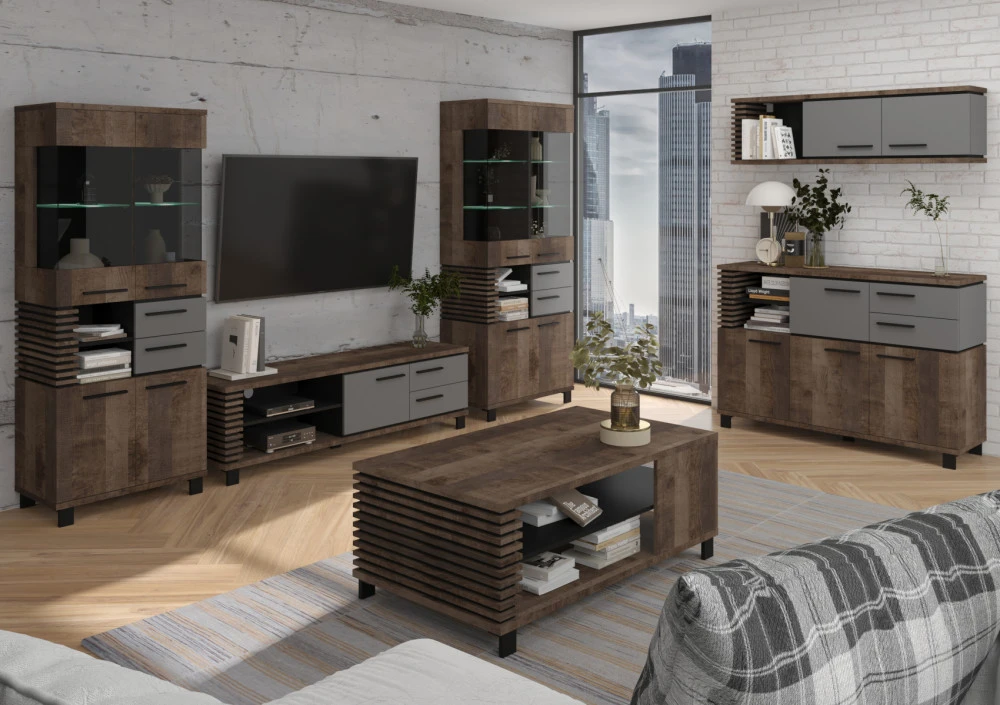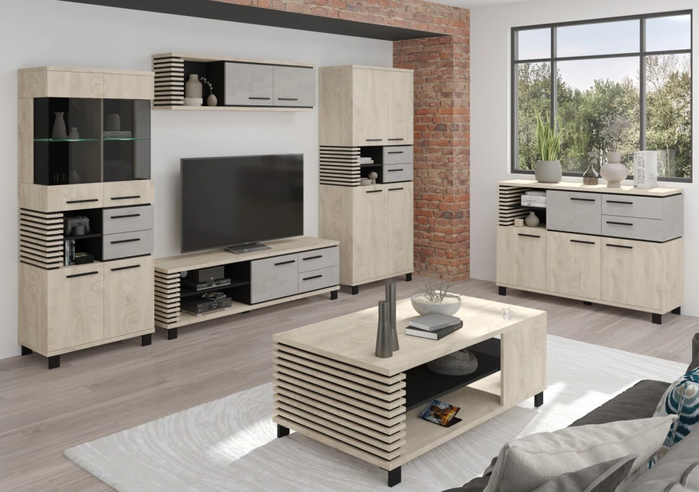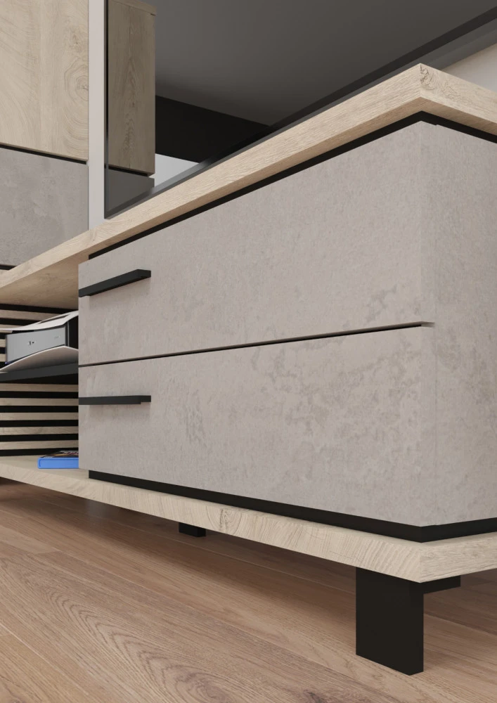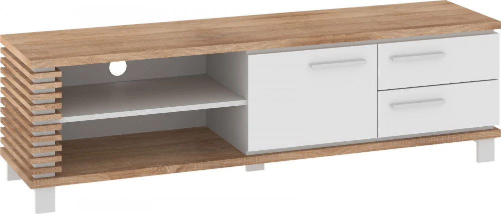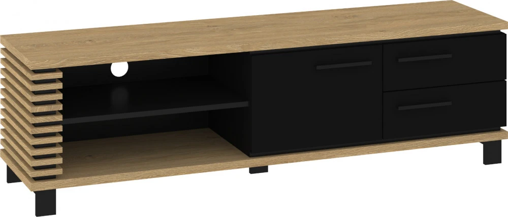 RTV stolek Lamir vás zaujme svým moderním elegantním designem s luxusními přírodními detaily. Je vyroben z kvalitních lamino desek o síle 16 mm a 25 mm. Desky mají ABS hranění, které zvyšuje odolnost pro odštípnutí hran. Součástí zásuvek a dvířek jsou jednoduché kovové úchyty a zároveň mají zabudovaný systém tichého dovírání. Nábytek stojí na 8 cm nožkách, které provzdušní váš interiér. Nabízíme vám několik barevných variant.Součástí stolku jsou 1 dvířka a 2 zásuvky na kovových pojezdech. na levé straně jsou 2 otevřené niky s připraveným přívodem pro kabeláž.Doporučujeme si vybrat z dalších komodit systému Lamir, ze kterých si vytvoříte svůj vysněný obývací pokoj, relaxační místnost či pracovnu.Nábytek dodáváme v demontu.