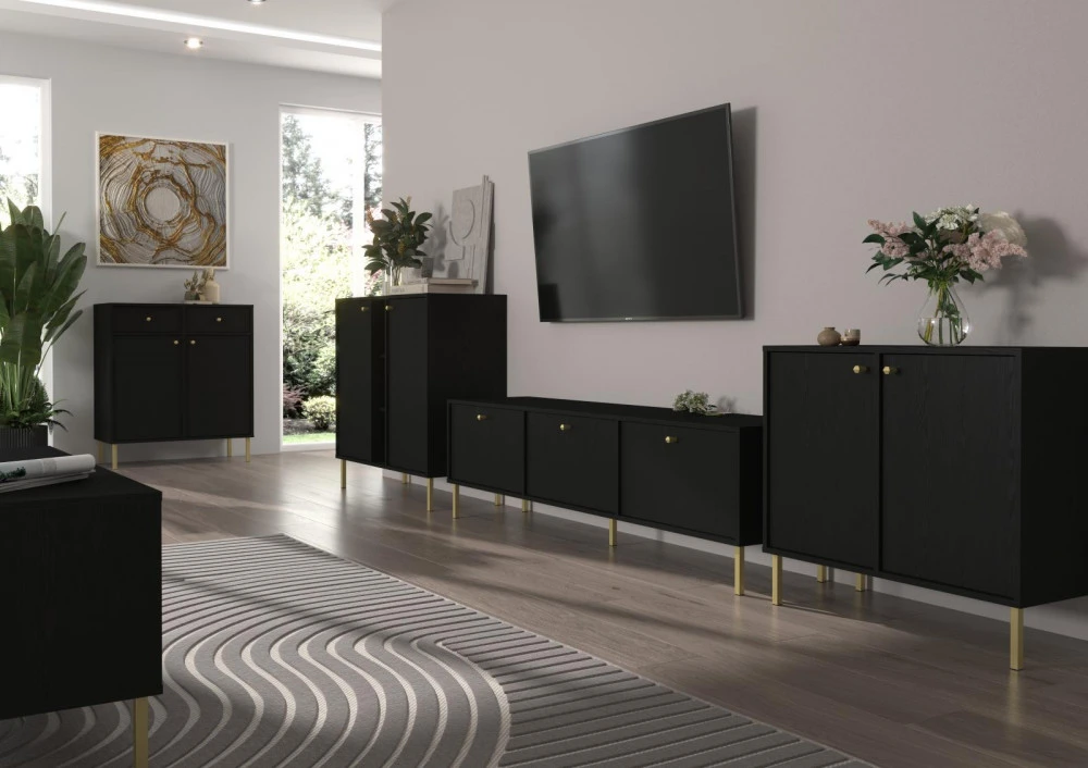 Série Tomila nabízí noční, TV i konferenční stolky, vitríny a komody v široké škále tvarů, barev a typů noh.