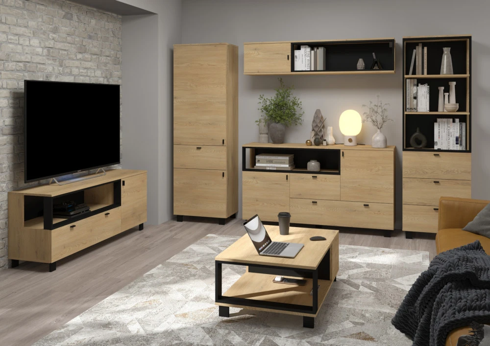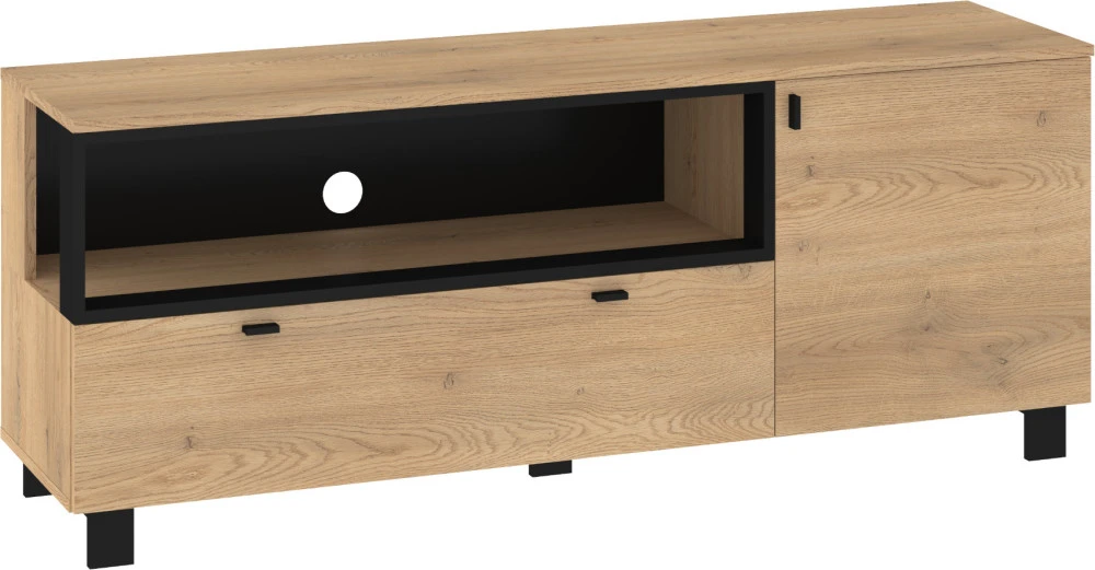 RTV stolek Vegas 13 vás zaujme svým moderním designem a přírodním provedením v kombinaci s černými či bílými detaily. Je vyroben z kvalitních lamino desek o síle 16 mm. Desky mají ABS hranění, které zvyšuje odolnost pro odštípnutí hran. Součástí zásuvek a dvířek jsou jednoduché černé kovové úchyty, zároveň mají zabudovaný systém tichého dovírání. Nábytek stojí na černých kovových nožkách o velikosti 8 cm, které provzdušní váš celkový prostor. Nabízíme vám několik barevných variant. Součástí stolku jsou 1 dvířka s 1 lakovanou policí a 1 zásuvka na kovových pojezdech. Nad zásuvkou je otevřená nika s připraveným vývodem pro kabeláž.Doporučujeme si vybrat z dalších komodit systému Vegas, ze kterých si vytvoříte svůj vysněný interiér. Nábytek dodáváme v demontu.