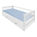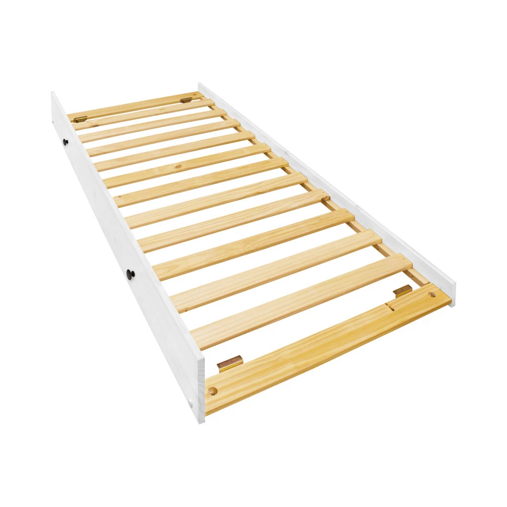 materiál masiv borovice, barevné provedení bílý lak kovové úchytky výsuvná na kolečkách, cena bez matrace maximální doporučená výška matrace 14 cm doporučený rozměr matrace 90 × 200 cm vhodná jako výsuvná přistýlka k pohovce TORINO 8085B