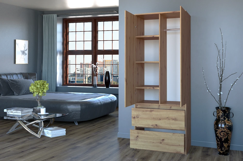 Šatní skříň Malvína v trendy barvách a moderním designu je praktický kus nábytku, který najde své uplatnění v ložnici, dětském pokoji, ale také v kanceláři nebo domácí pracovně. Nabízí dostatek úložného prostoru s možností instalace polic nebo šatní tyče v závislosti na vašich požadavcích. Dvířka se systémem TIP-ON se otevírají po jemném zatlačení čela dvířek. Nábytek je vyroben z nejkvalitnější laminované desky odolné proti poškrábání a vlhkosti, hrany jsou zakončené ABS materiálem.