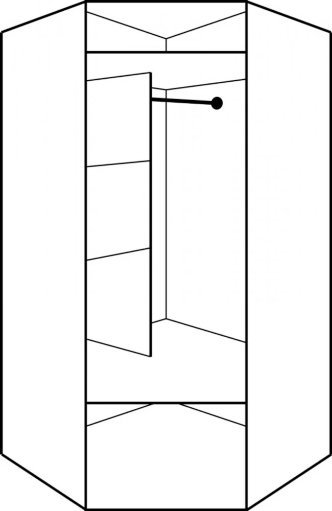 Prostorná rohová šatní skříň se zrcadlem je vhodná i do menších prostorů. V levé části jsou police, v pravé části šatní tyč. Ve spodní části je jedna velká police. Je vyrobena z lamina o síle 16 mm, na výběr z několika barevných variant. Dodáváno v demontu.