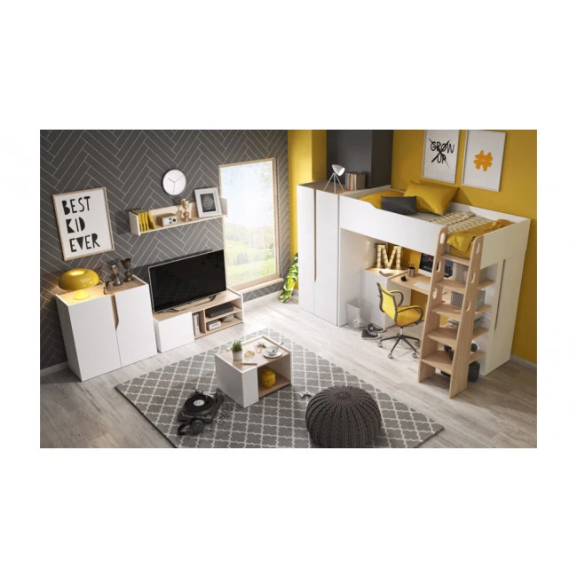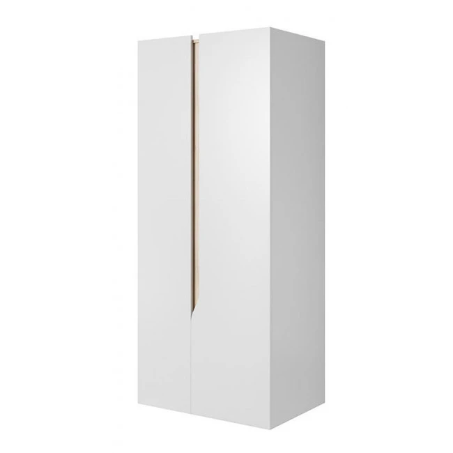 Šatní skříň 80 BUBU Laski 80/186,7/54 ze systému Bubu. Nábytek je určen především do dětských pokojů a lze složit z 8 komponentů. Barevné provedení bílá s doplňky jantarového dubu.