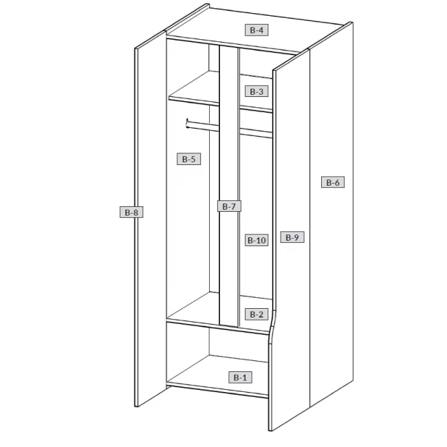 -uvnitř skříně je v horní části police a pod ní šatní tyč, v dolní části je police