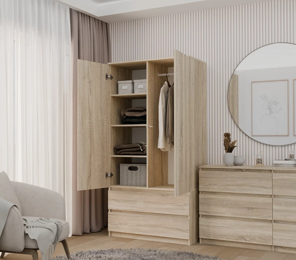 Šatní skříň Malvína v trendy barvách a moderním designu je praktický kus nábytku, který najde své uplatnění v ložnici, dětském pokoji, ale také v kanceláři nebo domácí pracovně. Nabízí dostatek úložného prostoru s možností instalace polic nebo šatní tyče v závislosti na vašich požadavcích. Dvířka se systémem TIP-ON se otevírají po jemném zatlačení čela dvířek. Nábytek je vyroben z nejkvalitnější laminované desky odolné proti poškrábání a vlhkosti, hrany jsou zakončené ABS materiálem.