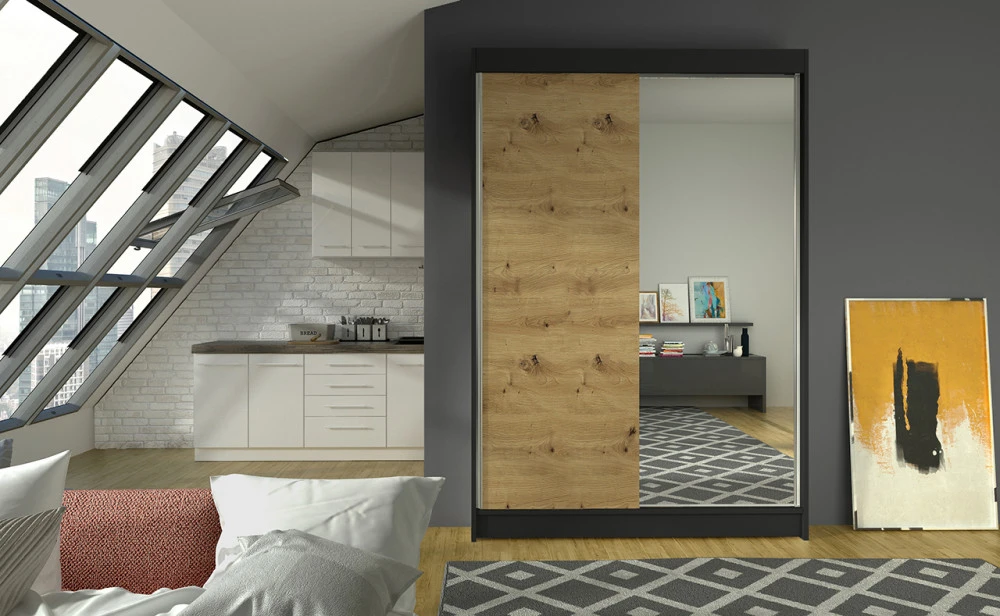 Skříň je vyrobena z kvalitního lamina. Díky svému vnitřnímu uspořádání nabízí dostatek úložného prostoru, posuvné dveře šetří prostor a zrcadlo ho opticky zvětšuje. Skříň je vhodná do ložnice, dětského nebo studentského pokoje, do předsíně i kanceláře. Vnitřní uspořádání skříně je vyobrazeno na fotografii. Skříň je dodávána v demontu. Součástí je i skleněné zrcadlo, které je nalepeno na jedné části dveří skříně a také montážní plánek včetně všech potřebných spojovacích materiálů. Vyobrazené dekorace nejsou v ceně.