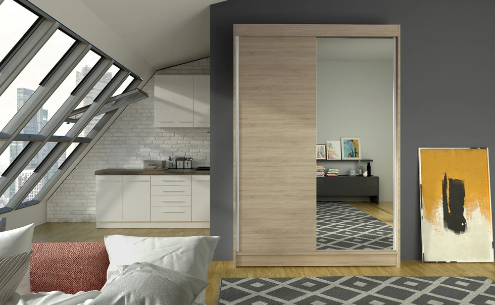 Skříň je vyrobena z kvalitního lamina. Díky svému vnitřnímu uspořádání nabízí dostatek úložného prostoru, posuvné dveře šetří prostor a zrcadlo ho opticky zvětšuje. Skříň je vhodná do ložnice, dětského nebo studentského pokoje, do předsíně i kanceláře. Vnitřní uspořádání skříně je vyobrazeno na fotografii. Skříň je dodávána v demontu. Součástí je i skleněné zrcadlo, které je nalepeno na jedné části dveří skříně a také montážní plánek včetně všech potřebných spojovacích materiálů. Vyobrazené dekorace nejsou v ceně.