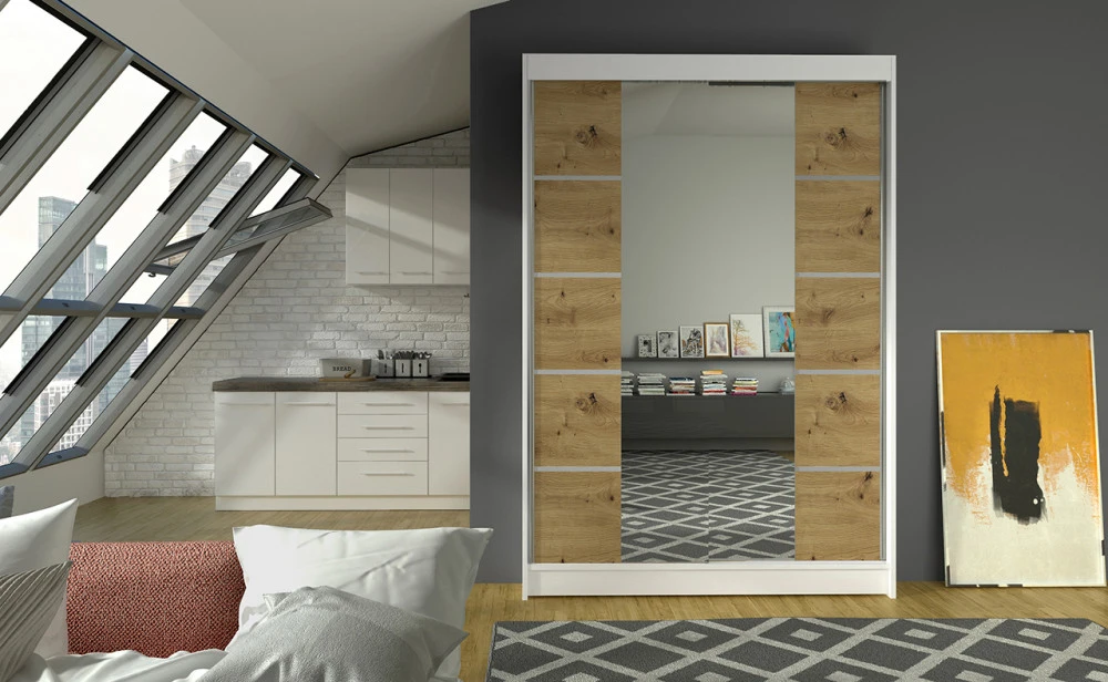 Skříň je vyrobena z kvalitního lamina. Díky svému vnitřnímu uspořádání nabízí dostatek úložného prostoru, posuvné dveře šetří prostor a zrcadlo ho opticky zvětšuje. Skříň je vhodná do ložnice, dětského nebo studentského pokoje, do předsíně i kanceláře. Vnitřní uspořádání skříně je vyobrazeno na fotografii. Skříň je dodávána v demontu. Součástí jsou i skleněná zrcadla, která jsou nalepena na dveřích skříně a také montážní plánek včetně všech potřebných spojovacích materiálů. Vyobrazené dekorace nejsou v ceně.
