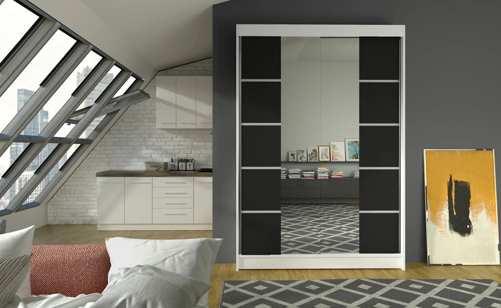 Skříň je vyrobena z kvalitního lamina. Díky svému vnitřnímu uspořádání nabízí dostatek úložného prostoru, posuvné dveře šetří prostor a zrcadlo ho opticky zvětšuje. Skříň je vhodná do ložnice, dětského nebo studentského pokoje, do předsíně i kanceláře. Vnitřní uspořádání skříně je vyobrazeno na fotografii. Skříň je dodávána v demontu. Součástí jsou i skleněná zrcadla, která jsou nalepena na dveřích skříně a také montážní plánek včetně všech potřebných spojovacích materiálů. Vyobrazené dekorace nejsou v ceně.