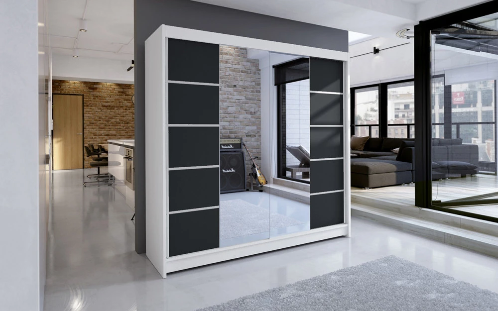Skříň je vyrobena z kvalitního lamina. Díky svému vnitřnímu uspořádání nabízí dostatek úložného prostoru, posuvné dveře šetří prostor a zrcadlo ho opticky zvětšuje. Skříň je vhodná do ložnice, dětského nebo studentského pokoje, do předsíně i kanceláře. Vnitřní uspořádání skříně je vyobrazeno na fotografii. Skříň je dodávána v demontu. Součástí jsou i skleněná zrcadla, která jsou nalepena na dveřích skříně a také montážní plánek včetně všech potřebných spojovacích materiálů. Vyobrazené dekorace nejsou v ceně.