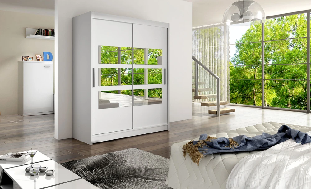 Jednoduchý a elegantní design skříně osloví i náročné zákazníky. Eleganci podtrhují dlouhé stříbrné úchyty a součástí jsou i skleněná zrcadla, která jsou nalepena na dveřích skříně. Je vyrobena z lamina o síle 16 mm a hrany jsou ukončeny ABS lištou. Vodící lišty jsou vyrobeny z odolného hliníku a splňují požadavky pro každodenní užívání. Díky svému uspořádání poskytuje dostatek úložného prostoru a zrcadlo prostor opticky zvětší a prosvětlí. Skvěle se hodí do ložnice, předsíně, dětského, nebo studentského pokoje. Skříň je dodávána v demontu a součástí je montážní plánek včetně všech potřebných spojovacích materiálů. Vyobrazené dekorace nejsou v ceně.