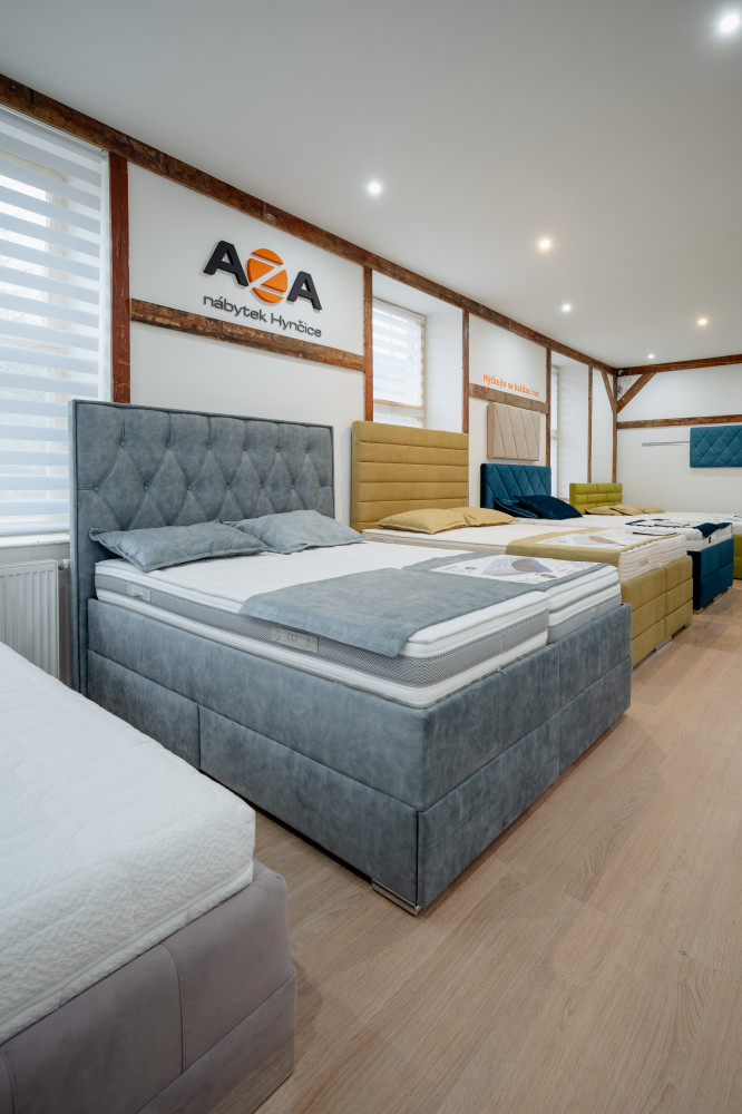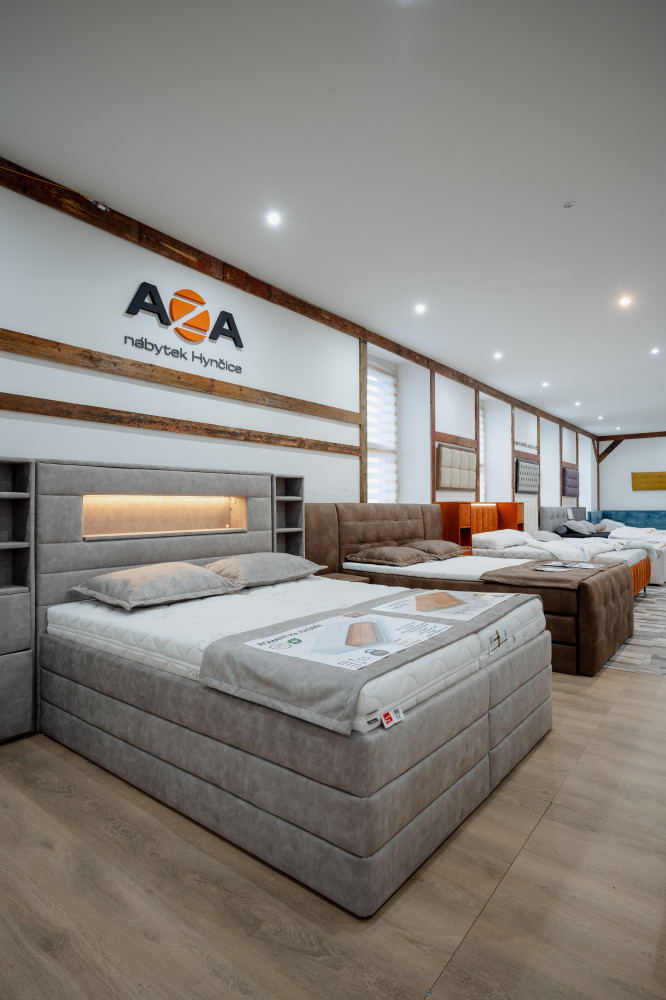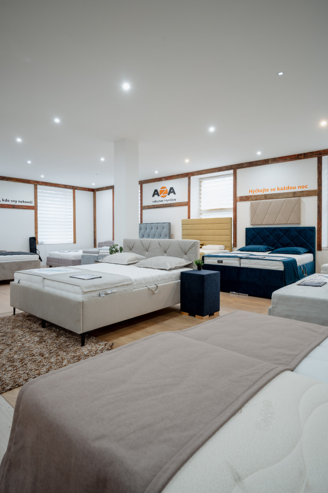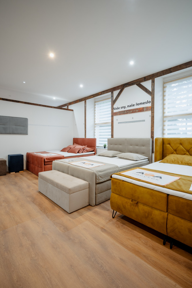 Ve vrchním patře najdete také výběr prémiových čalouněných postelí z naší výroby. Postele si můžete nejen vyzkoušet, ale i osahat použité materiály a v klidu porovnat jednotlivá řešení komfortu a zpracování.