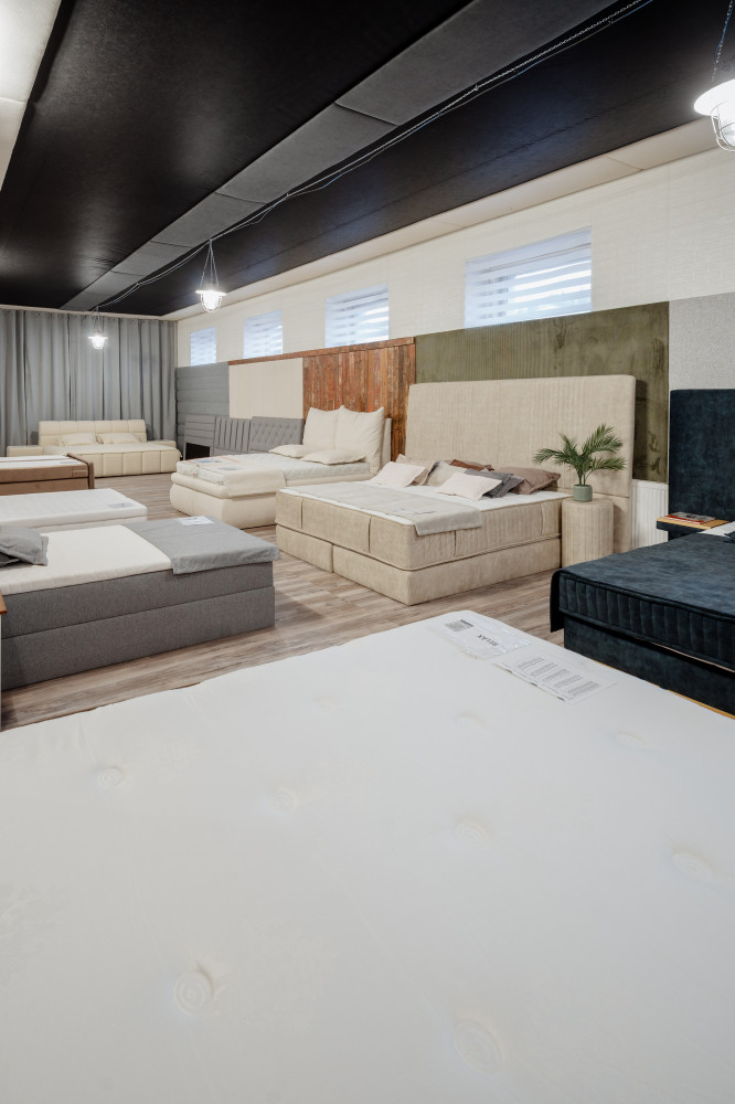 Na ploše přibližně 1 000 m² na vás čeká více než 100 postelí, rozkládacích pohovek na každodenní spaní a další čalouněný nábytek, který si můžete osobně vyzkoušet, osahat a porovnat.